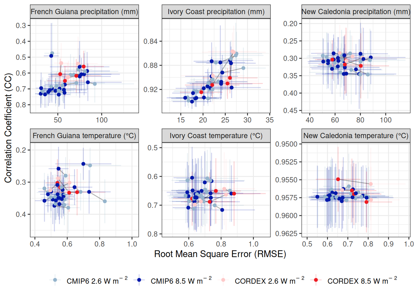 Fig 3. Evaluation of downscaled projections from global (CMIP6) and regional (CORDEX) climate models. Monthly precipitation and mean temperature from climate models were downscaled against CHELSA2 data for the period 1980-2005 for French Guiana, Ivory Coast and New Caledonia. We evaluated downscaled projected monthly precipitation against CHIRPS data and downscaled projected monthly mean temperature against GSHTD data for the period 2006-2019. The x-axis represents the root mean square error (RMSE) and the y-axis the correlation coefficient (CC), such that the best evaluation is located in the lower left corner with a RMSEP of 0 and a CC of 1. Each point represents the mean evaluation across months of a single climate model for scenario 2.6 or 8.5, with intervals around representing half the standard deviation across months. Blue dots represent CMIP6 global climate models with scenario 2.6 in light blue and 8.5 in dark blue, while red dots represent CORDEX regional climate models with scenario 2.6 in light red and 8.5 in dark red. Grey lines connecting two dots represent matching scenarios for a single model. Zoom on model mean evaluations can be found in Supplementary Figure S3, while details on model evaluations across months can be found in Supplementary Figure S4. The evaluations show that we do not have a single best climate model, but that the best climate models are context dependent, which underlines the importance of the ensemble forecasting approach, as shown in Fig. 4.