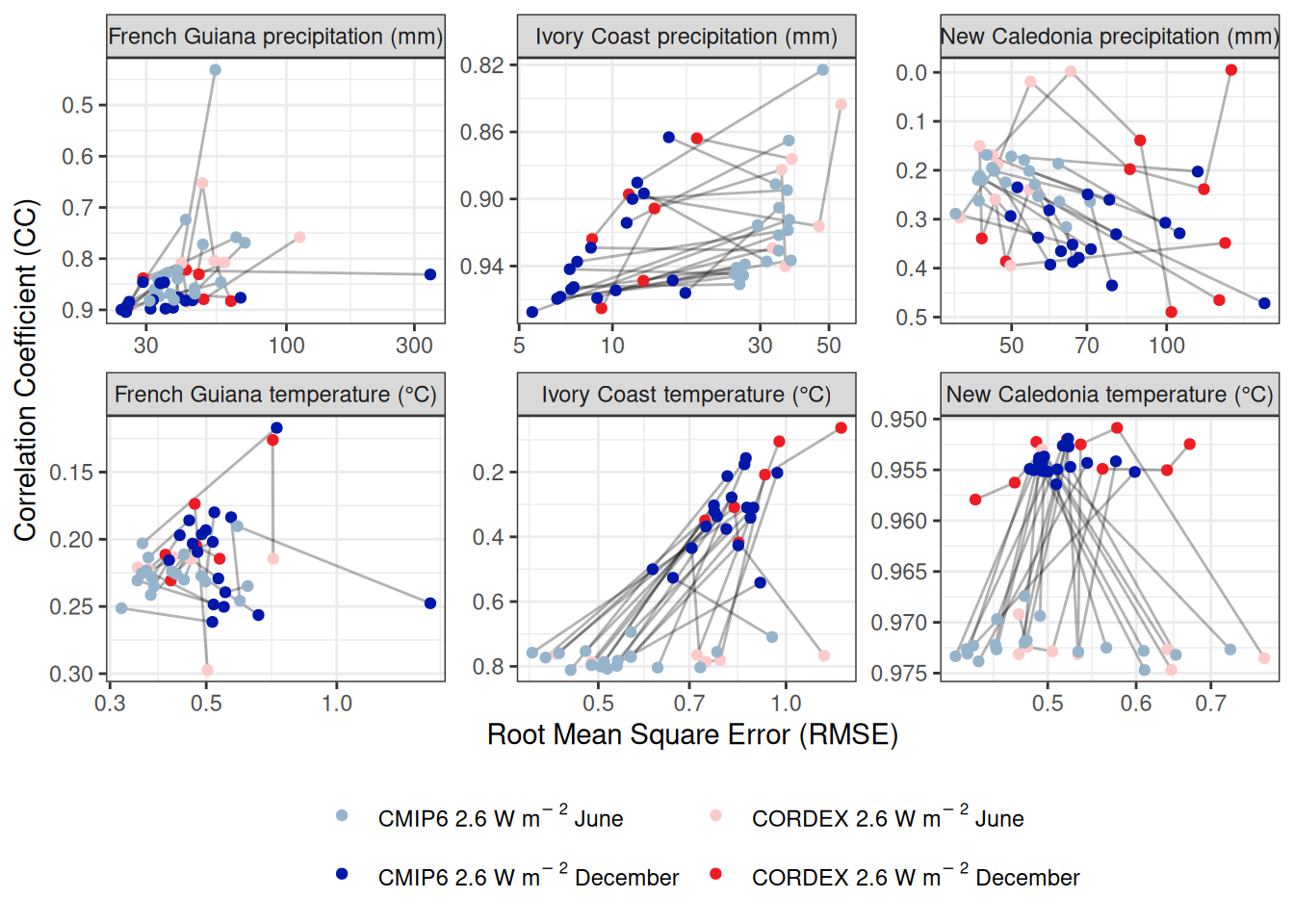 Fig S4. Evaluation of downscaled projections from global (CMIP6) and regional (CORDEX) climate models. Monthly precipitation and mean temperature from climate models were downscaled against CHELSA2 data for the period 1980-2005 for French Guiana, Ivory Coast and New Caledonia. We evaluated downscaled projected monthly precipitation against CHIRPS data and downscaled projected monthly mean temperature against GSHTD data for the period 2006-2019. The x-axis represents the root mean square error (RMSE) and the y-axis the correlation coefficient (CC), such that the best evaluation is located in the lower left corner with a RMSEP of 0 and a CC of 1. Each point represents the evaluation for June or December of a single climate model for scenario 2.6. Blue dots represent CMIP6 global climate models with June in light blue and December in dark blue, while red dots represent CORDEX regional climate models with June in light red and December in dark red. Grey lines connecting two dots represent matching scenarios for a single model.