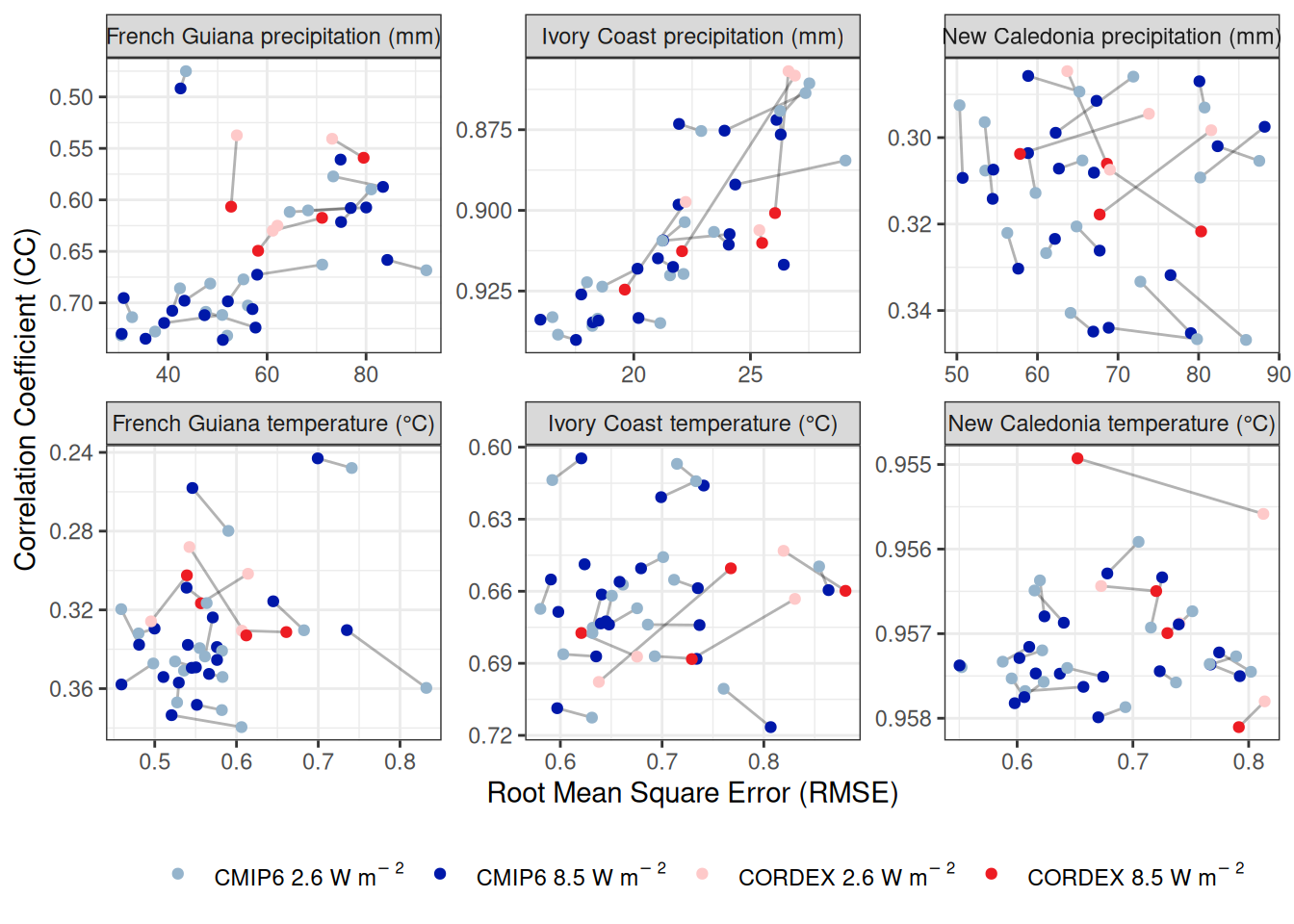 Fig S3. Evaluation of downscaled projections from global (CMIP6) and regional (CORDEX) climate models. Monthly precipitation and mean temperature from climate models were downscaled against CHELSA2 data for the period 1980-2005 for French Guiana, Ivory Coast and New Caledonia. We evaluated downscaled projected monthly precipitation against CHIRPS data and downscaled projected monthly mean temperature against GSHTD data for the period 2006-2019. The x-axis represents the root mean square error (RMSE) and the y-axis the correlation coefficient (CC), such that the best evaluation is located in the lower left corner with a RMSEP of 0 and a CC of 1. Each point represents the mean evaluation across months of a single climate model for scenario 2.6 or 8.5. Blue dots represent CMIP6 global climate models with scenario 2.6 in light blue and 8.5 in dark blue, while red dots represent CORDEX regional climate models with scenario 2.6 in light red and 8.5 in dark red. Grey lines connecting two dots represent matching scenarios for a single model.