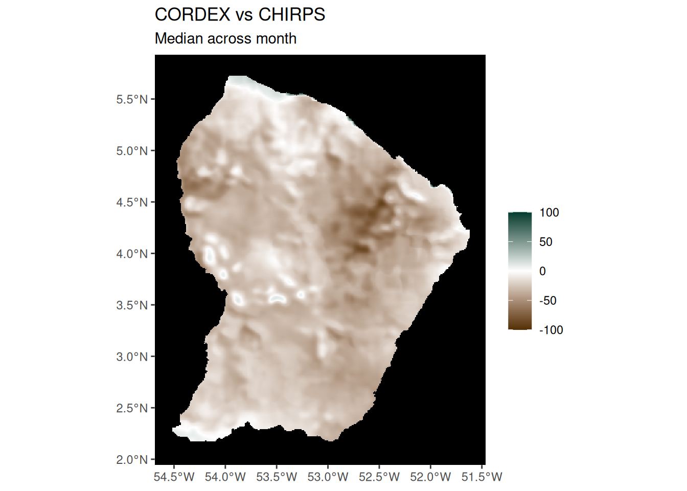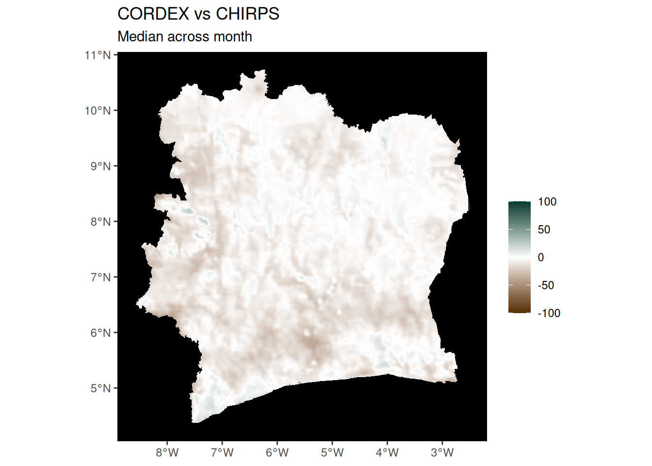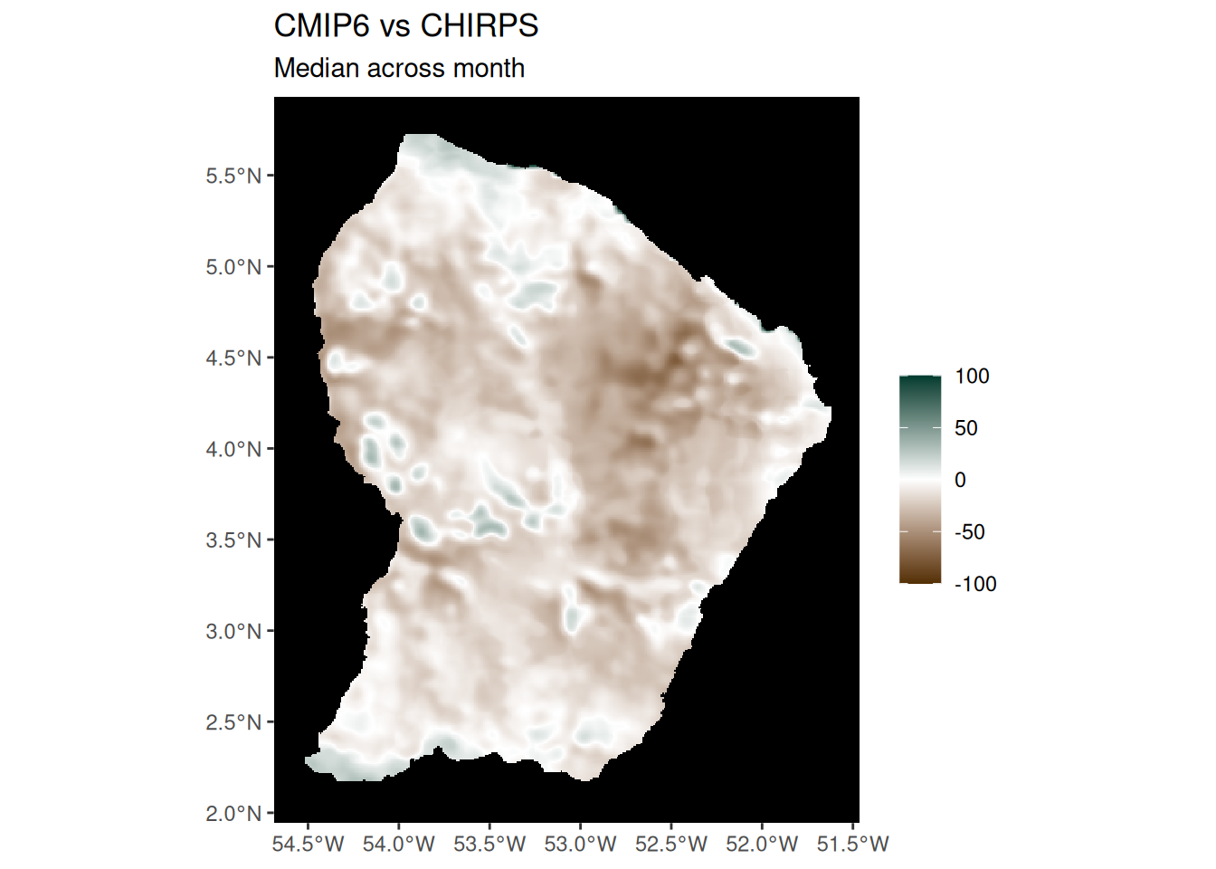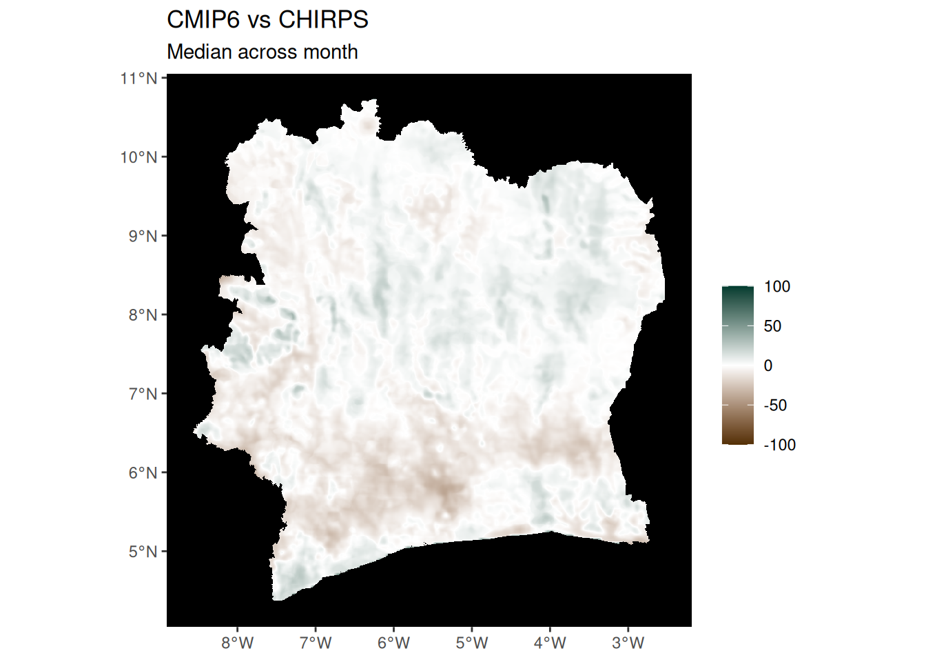ggtitle("CMIP6 vs CHIRPS", "Median across month") +