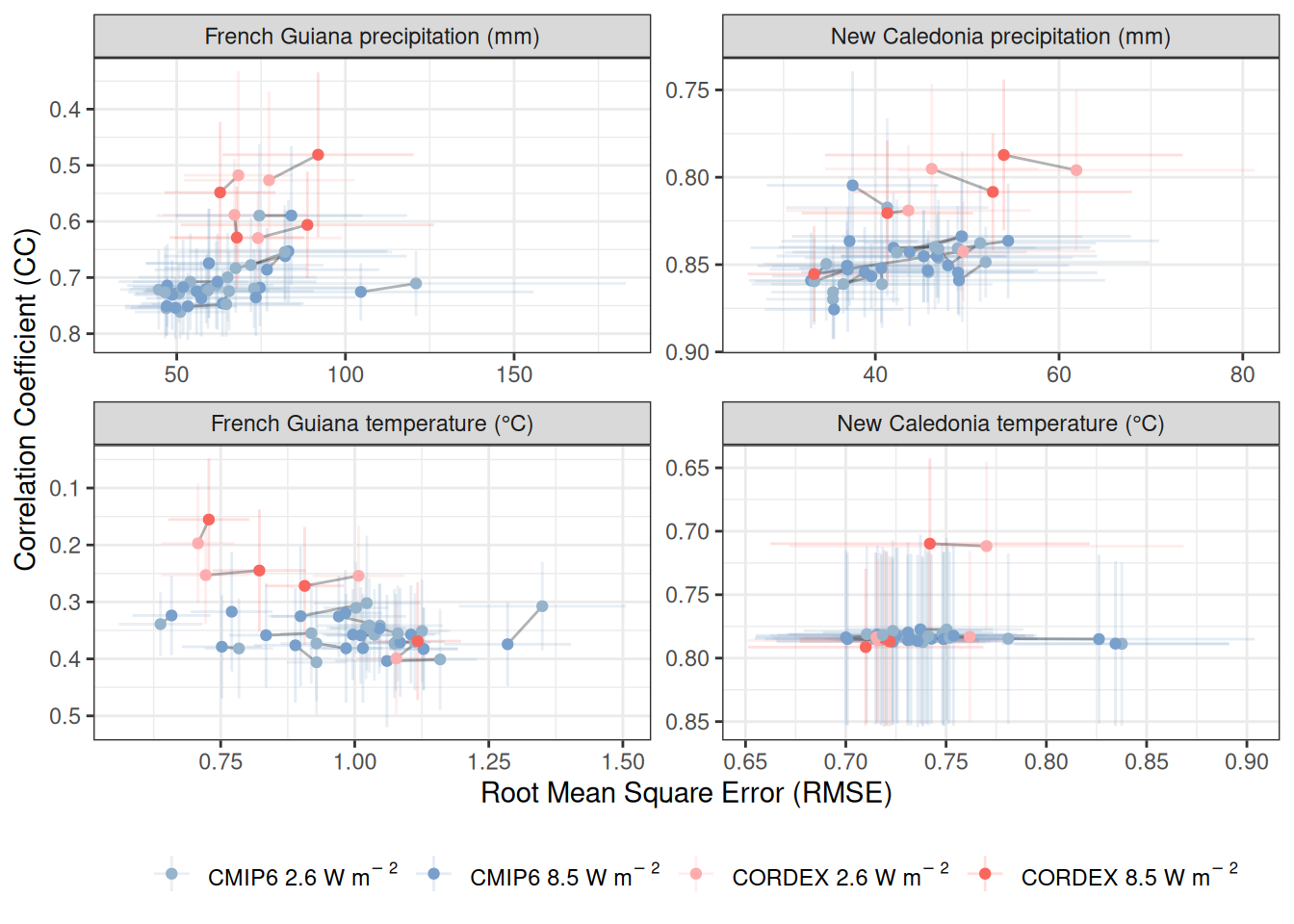 Fig S6. Evaluation of downscaled projections from global (CMIP6) and regional (CORDEX) climate models. Monthly precipitation and mean temperature from climate models were downscaled against CHELSA2 data for the period 1980-2005 for French Guiana and Ivory Coast. We evaluated downscaled projected monthly precipitation monthly mean temperature against punctual Meteo-France data for the period 2006-2019 with a minimum of 6 complete years. The x-axis represents the root mean square error (RMSE) and the y-axis the correlation coefficient (CC), such that the best evaluation is located in the lower left corner with a RMSEP of 0 and a CC of 1. Each point represents the mean evaluation across months of a single climate model for scenarios 2.6 or 8.5, with intervals around representing half the standard deviation across months. Blue dots represent CMIP6 global climate models with scenario 2.6 in light blue and 8.5 in dark blue, while red dots represent CORDEX regional climate models with scenario 2.6 in light red and 8.5 in dark red. Grey lines represent matching scenarios for a single model.