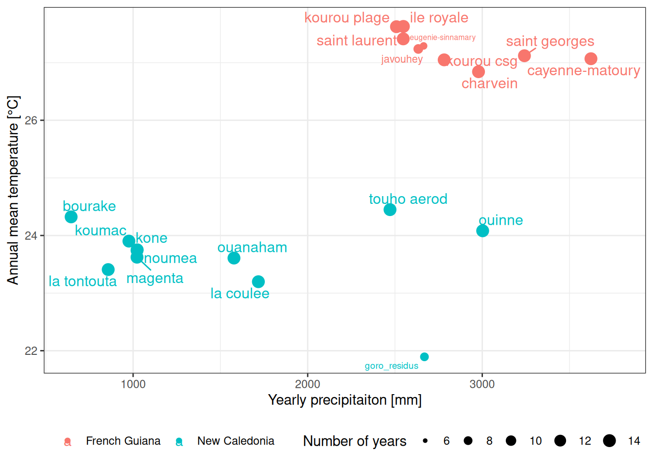 Fig S5. Yearly precipitation and mean temperature from punctual Meteo-France data for the period 2006-2019 with a minimum of 6 complete years in French Guiana (red) and New Caledonia (blue). Point size represents the number of complete years in the data.