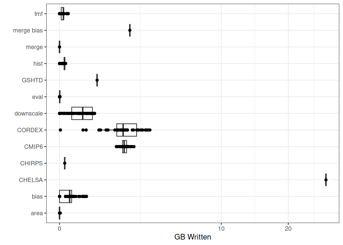 We quickly reported benchmarks of the tool for other users. Most rules takes less than a minute except the one retrieving data. CORDEX and CMIP6 retrieval takes around 7 minutes and almost always less than 10 minutes. CHELSA 2 retrieval takes more than 20 minutes but is only done once. Similarly most rules are using less than 1 GB of memory, except CMIP6 retrieval that approach 10 GB, CORDEX retrieval above 20 GB, and CHELSA 2 retrieval above 30 GB. Finally most rules write less than 1 GB, CORDEX and CMIP6 around 5 GB, and CHELSA more than 20 GB, but a lot are only temporary files.